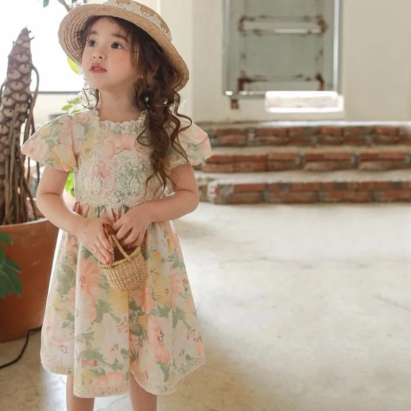 法式花朵泡泡袖洋裝