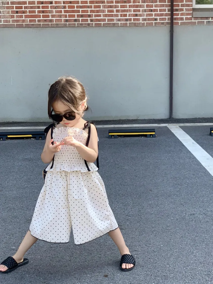波點收腰吊帶上衣+寬褲