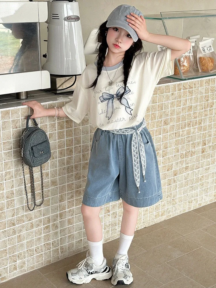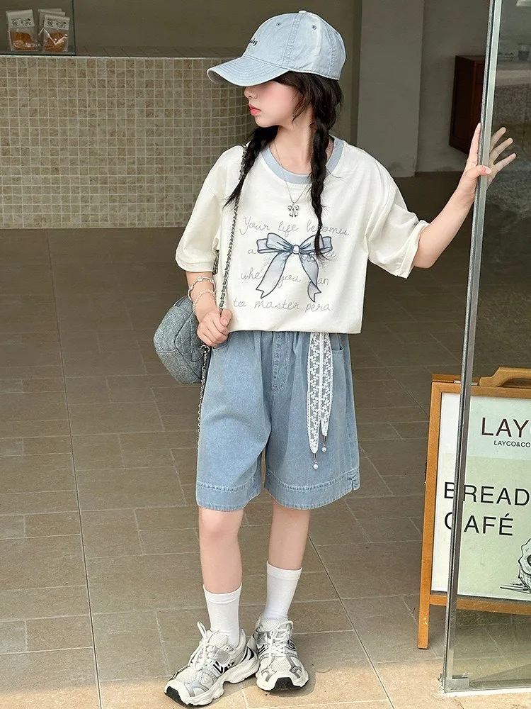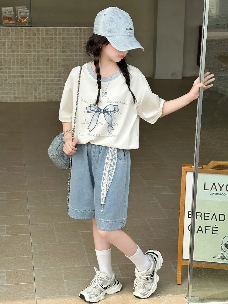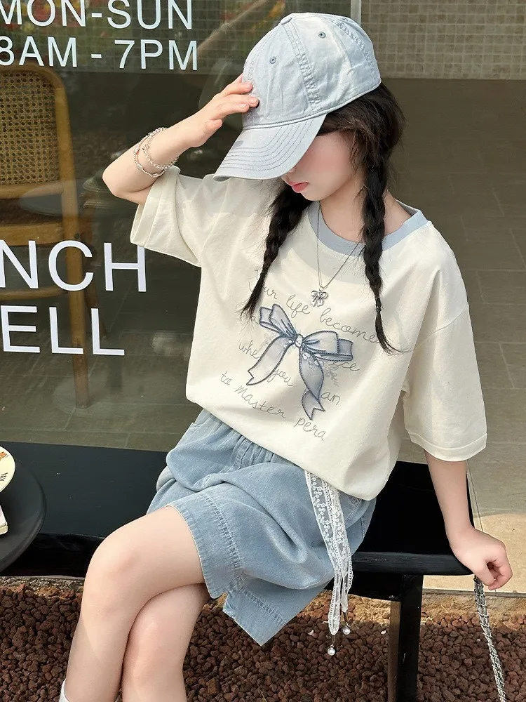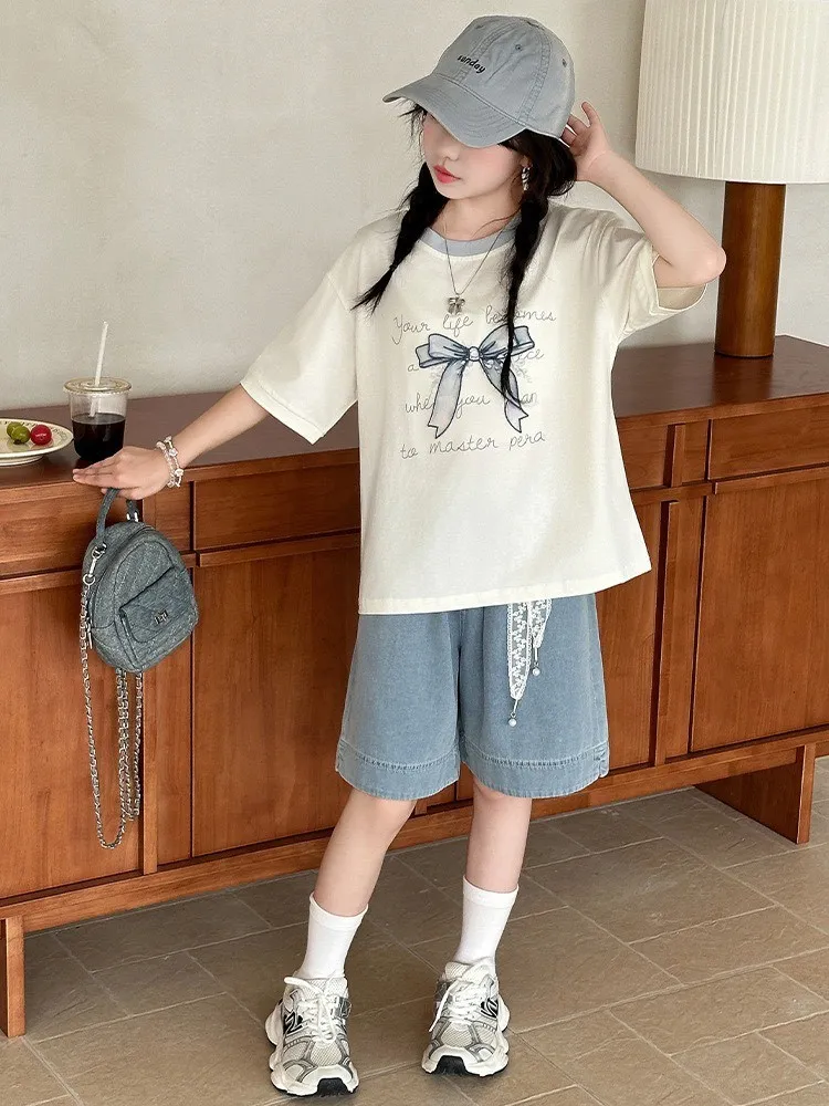 蝴蝶結寬鬆上衣+牛仔五分褲