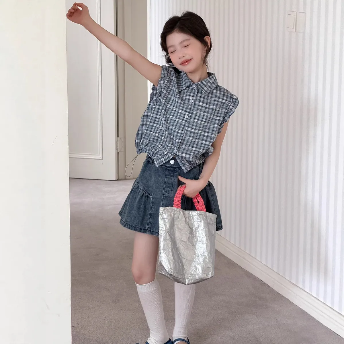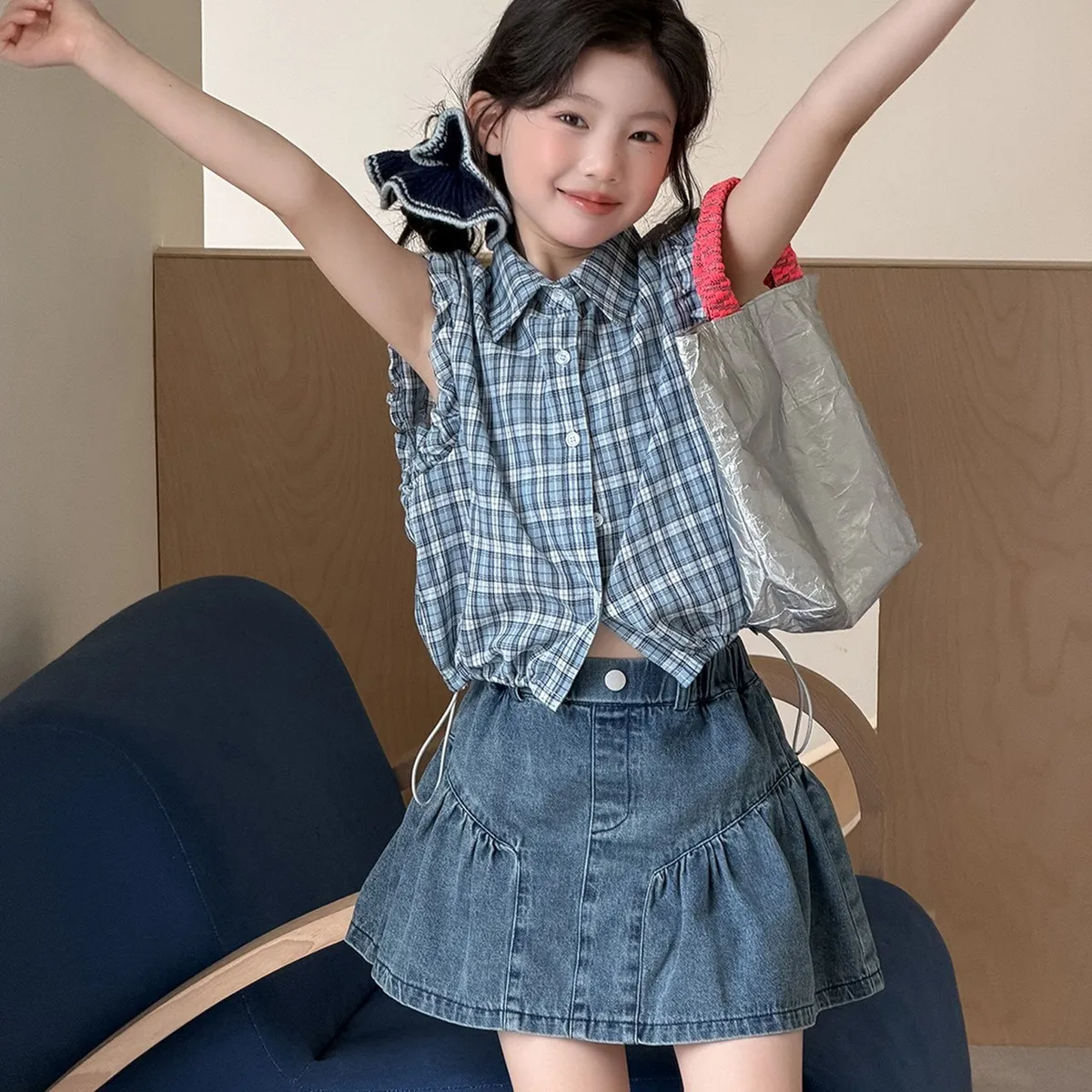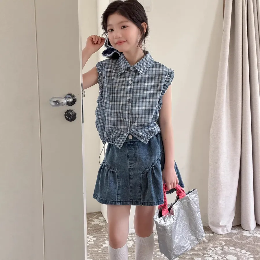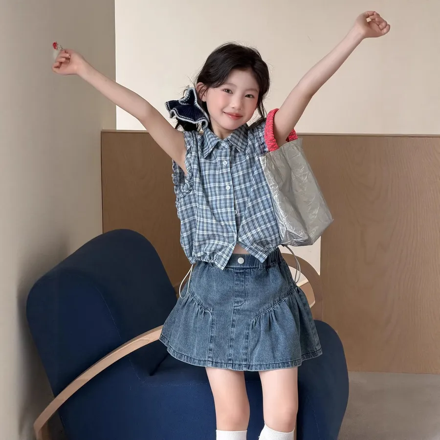 🌸【無袖格子襯衫+百搭牛仔短裙】女童夏日活力套裝