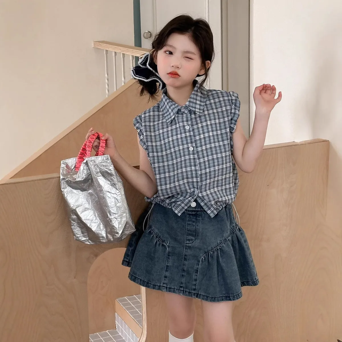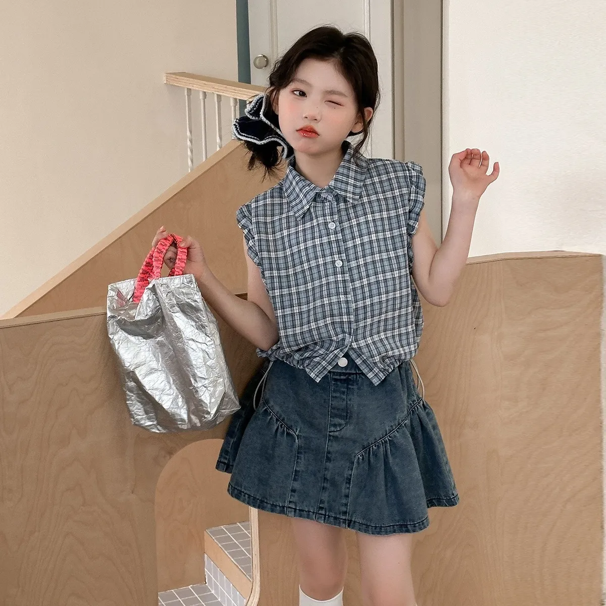 清爽無袖格子襯衫搭配經典百搭牛仔短裙,