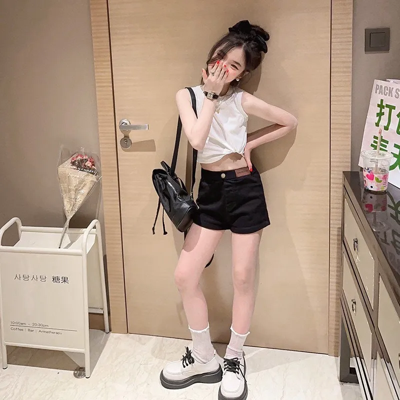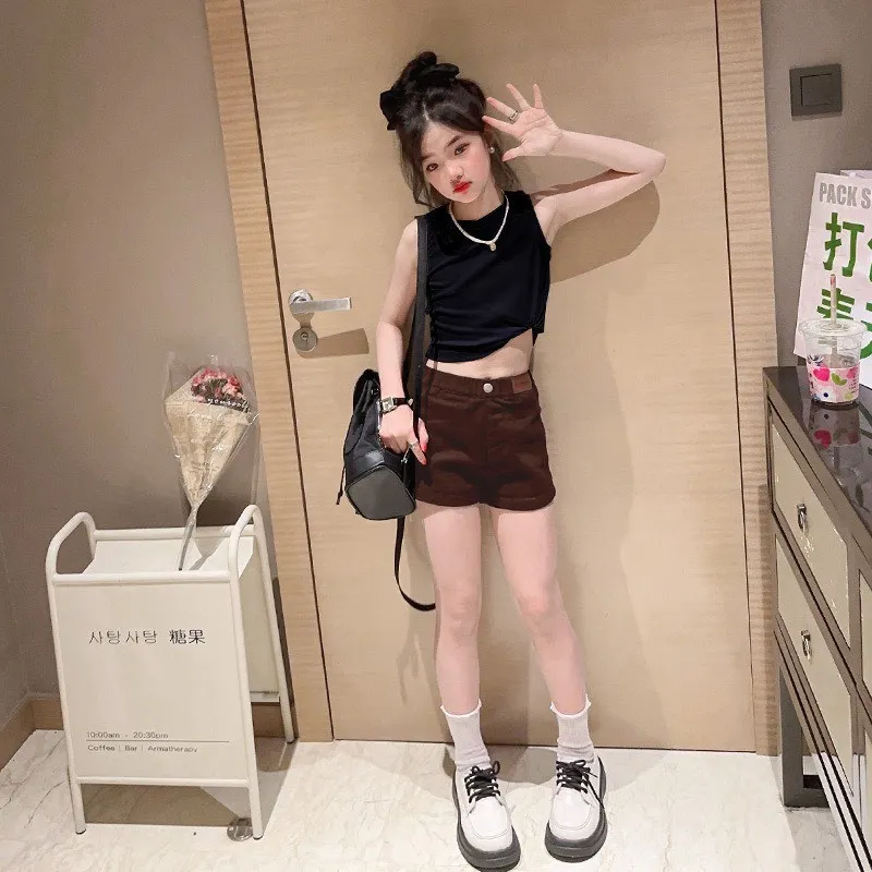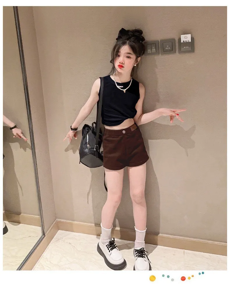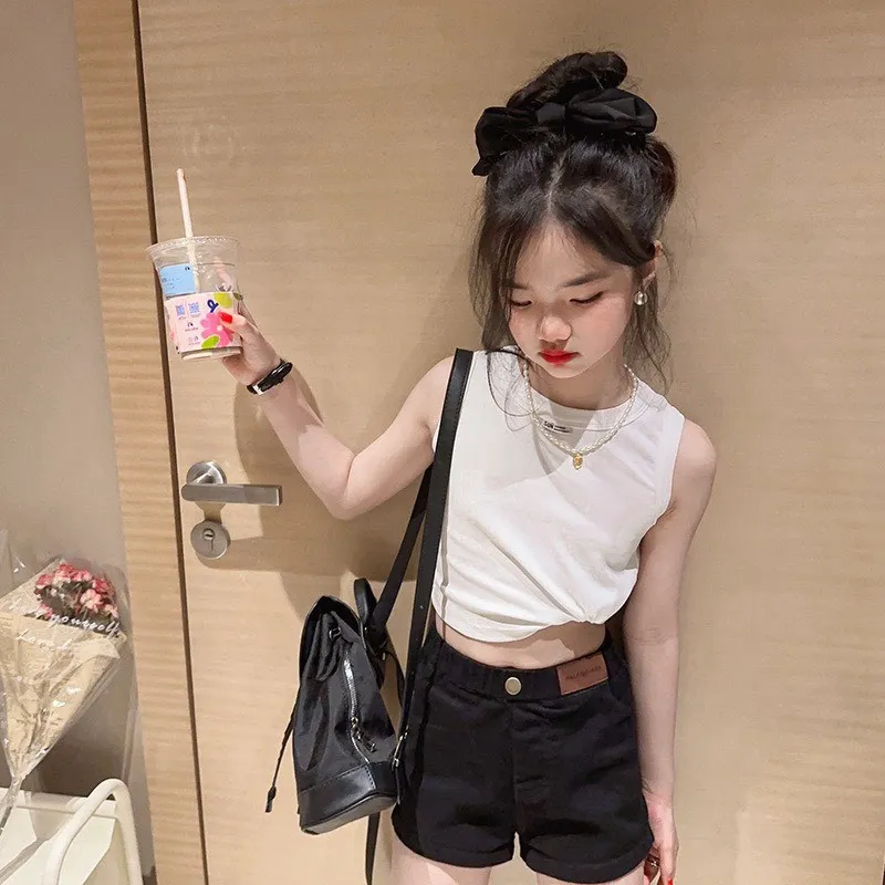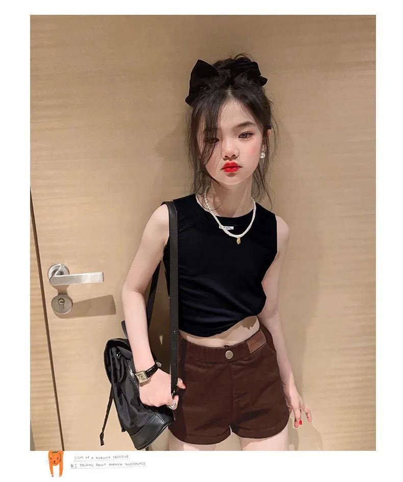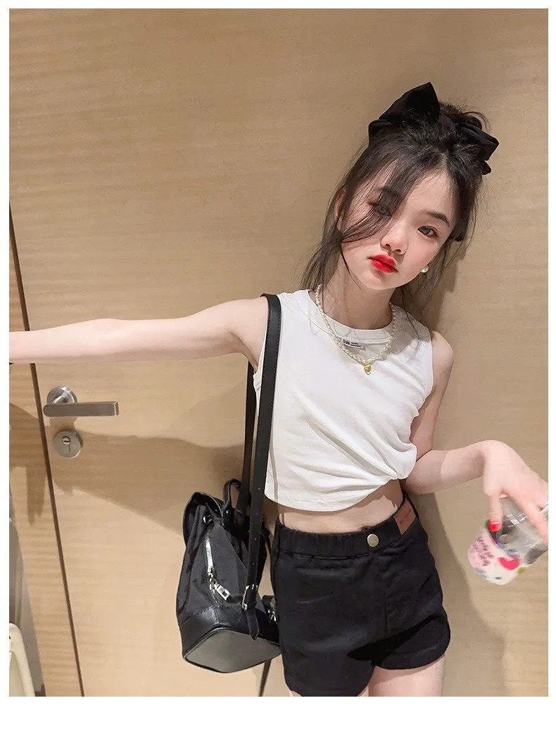 微風吹過的午後,小女孩穿上 休閒時尚無袖短版T恤,