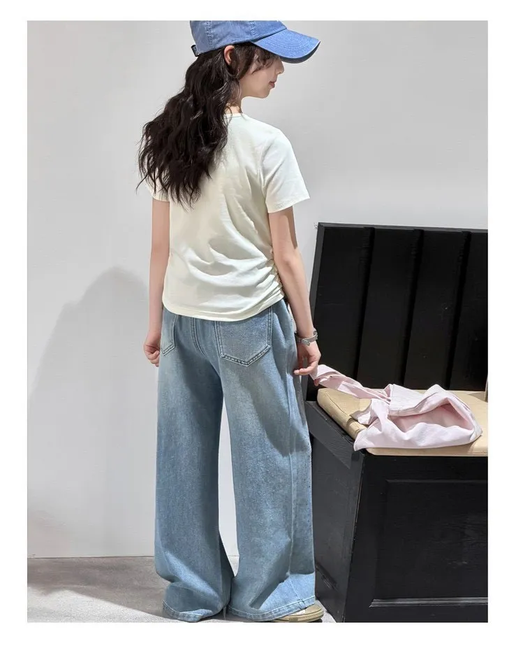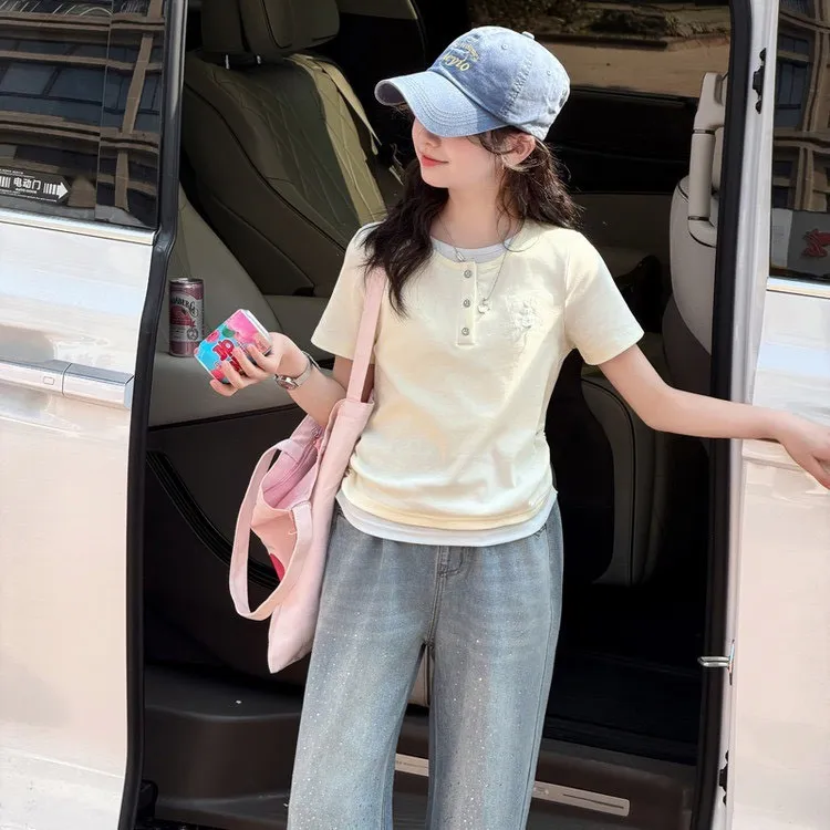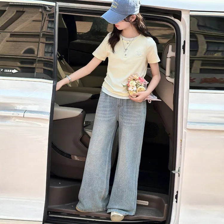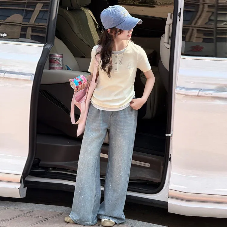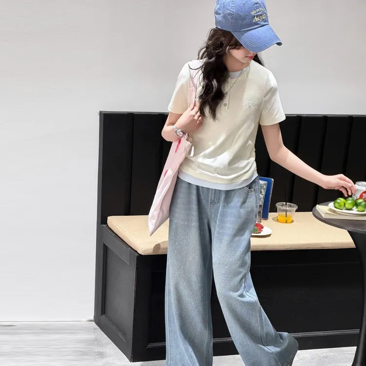 這套「休閒短袖T恤+燙鑽牛仔褲」