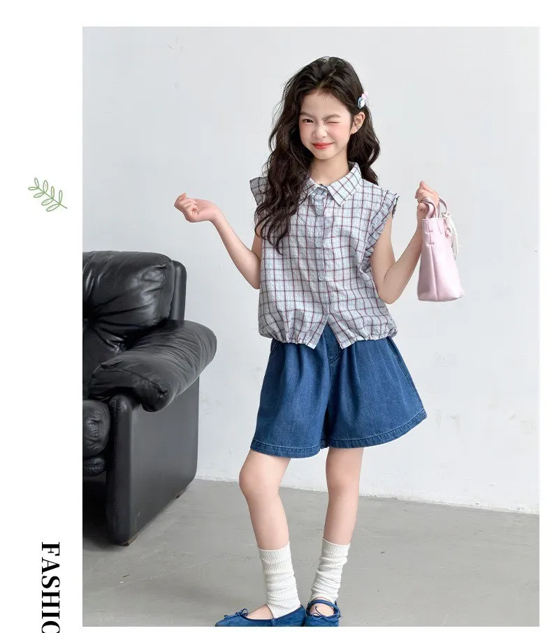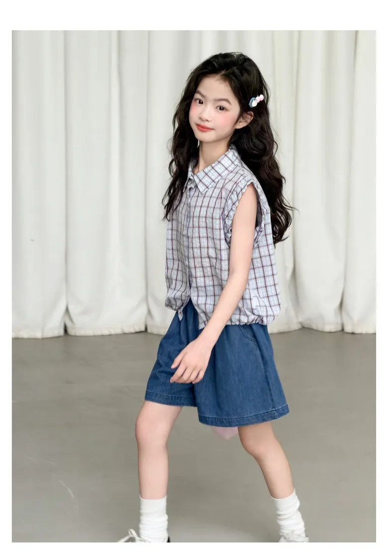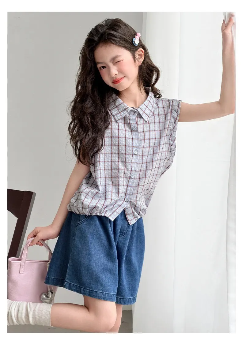 學院風格紋無袖襯衫/牛仔褲