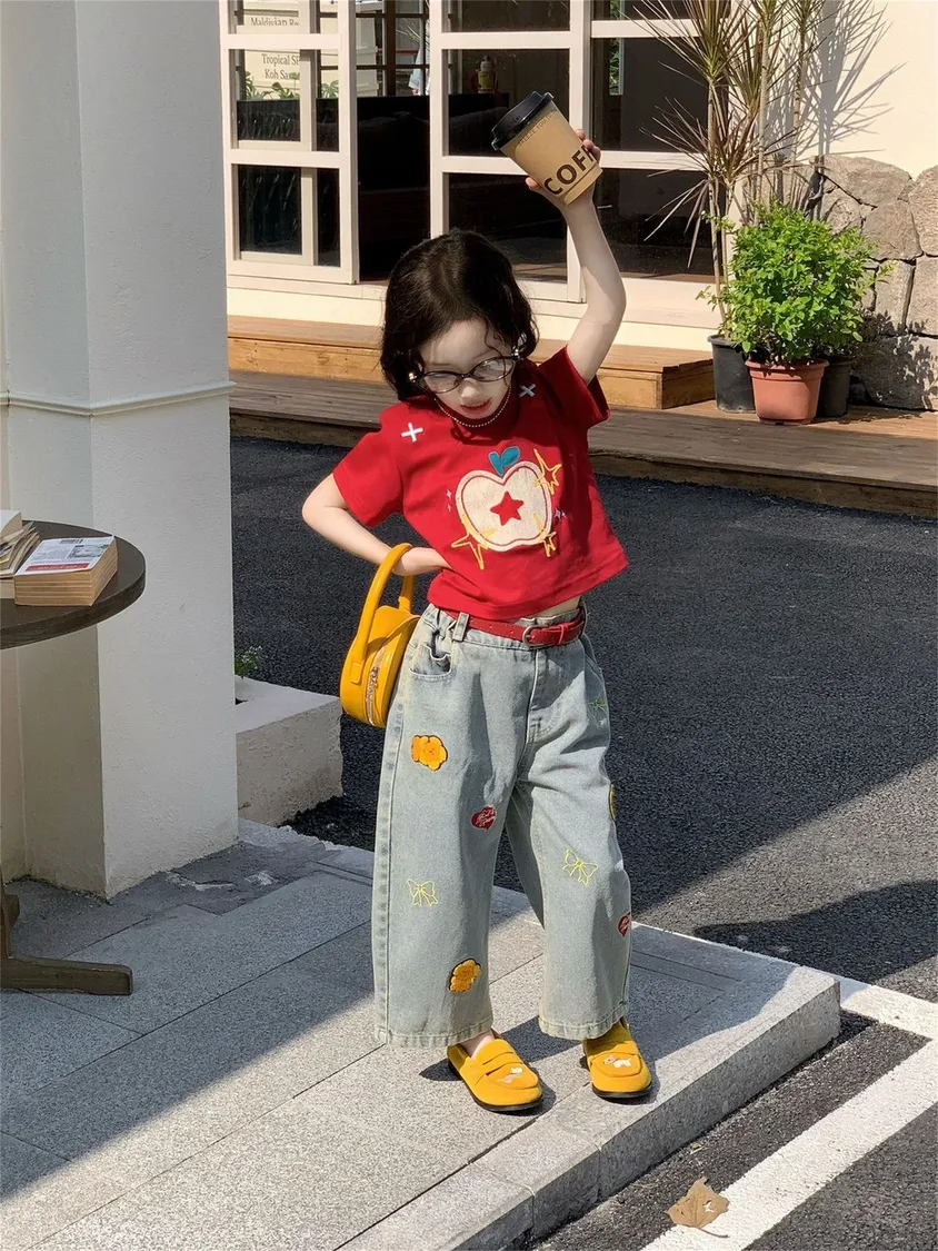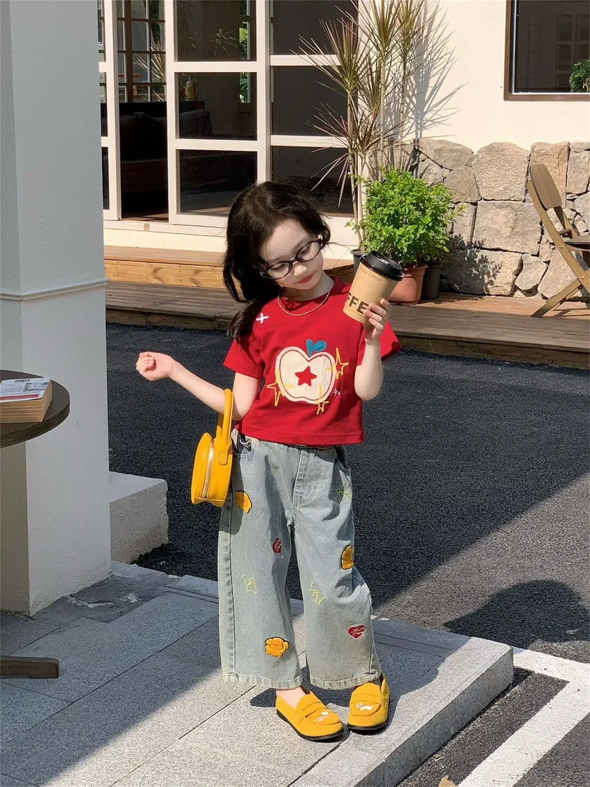 百搭俏皮紅蘋果T恤/刺繡牛仔褲兩件套