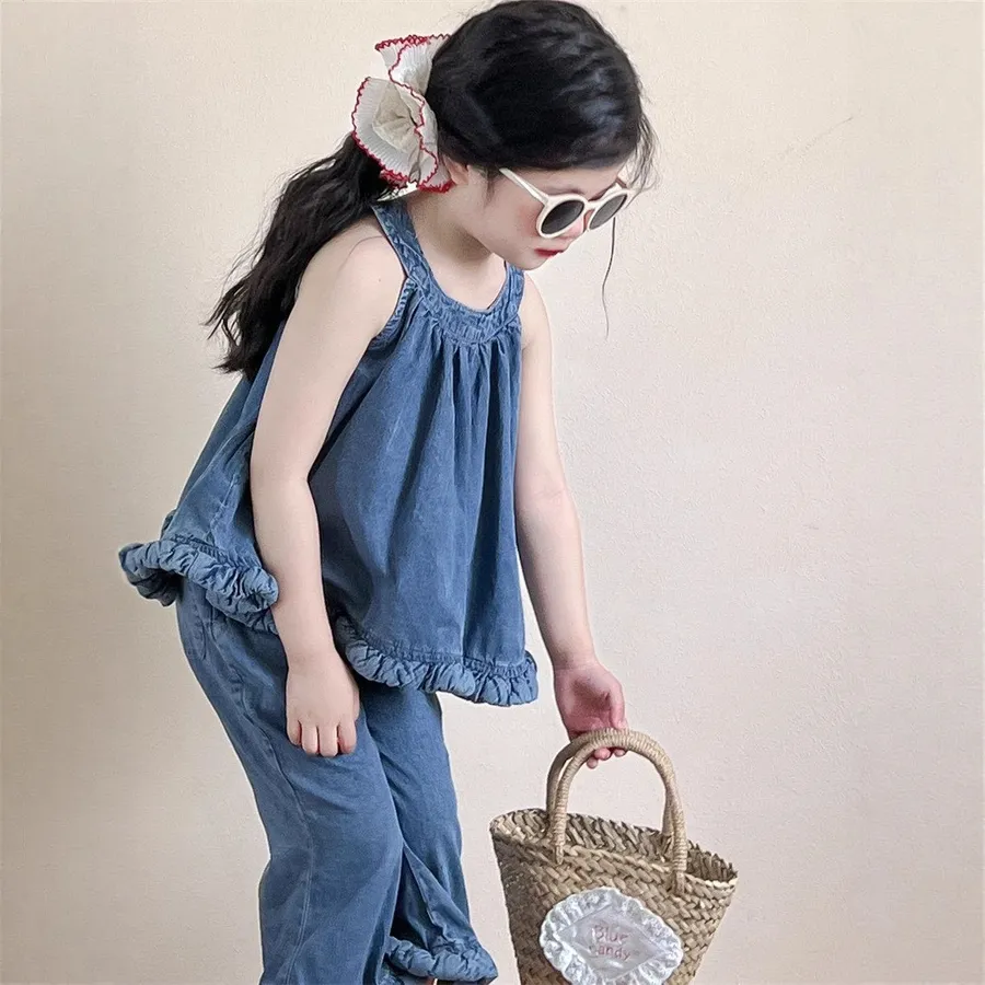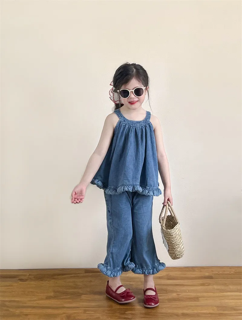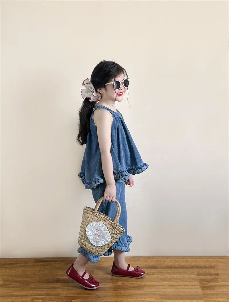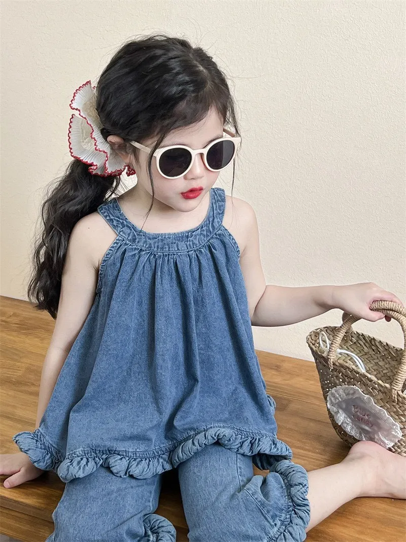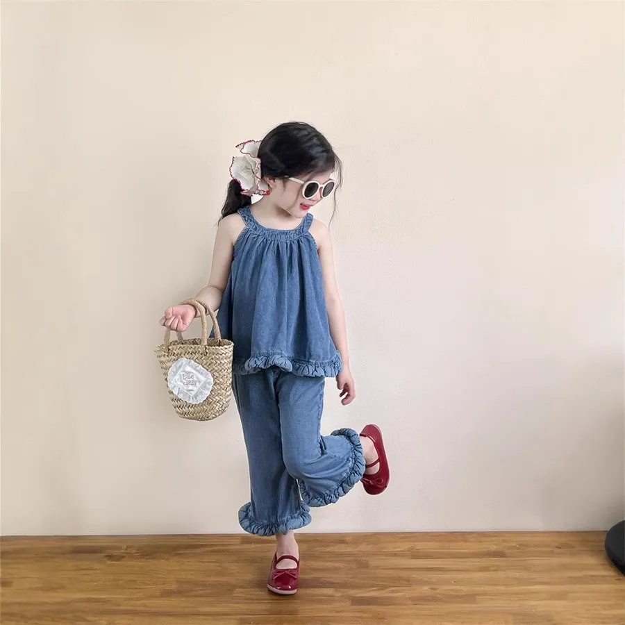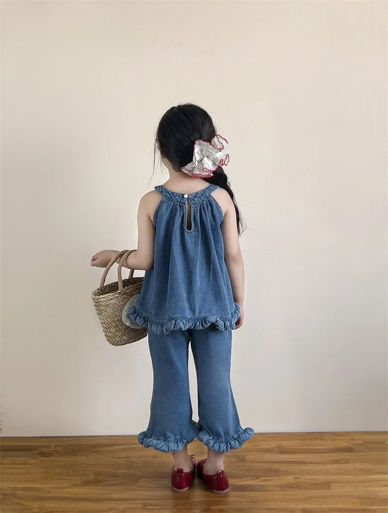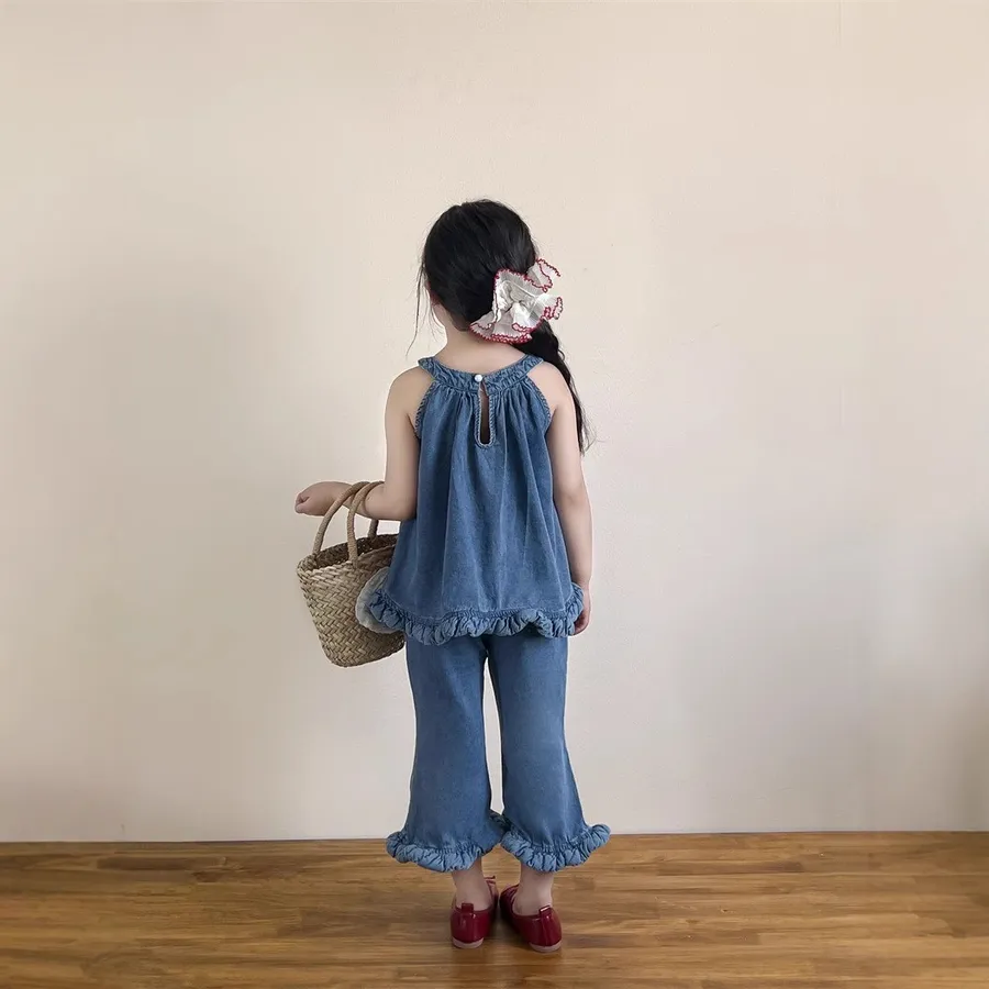 選用布料材質: 50%棉✨ 上衣 – 不規則無袖牛仔上衣個性不規則剪裁,打破單調設計,時髦感滿分;經典牛仔元素,耐看又百搭,怎麼穿都好看;✨ 下身 – 時髦喇叭褲微喇叭版型設計,修飾腿型,拉長比例更顯高;與牛仔上衣搭配,甜酷有型,打造小小時尚ICON。