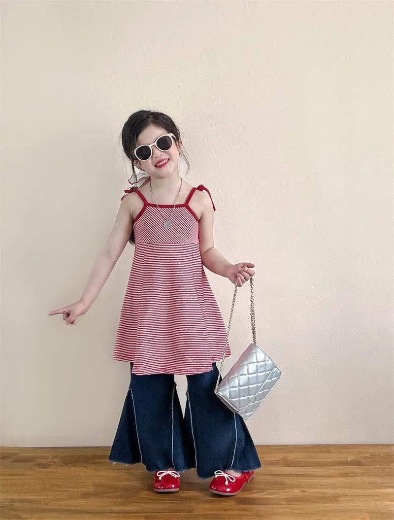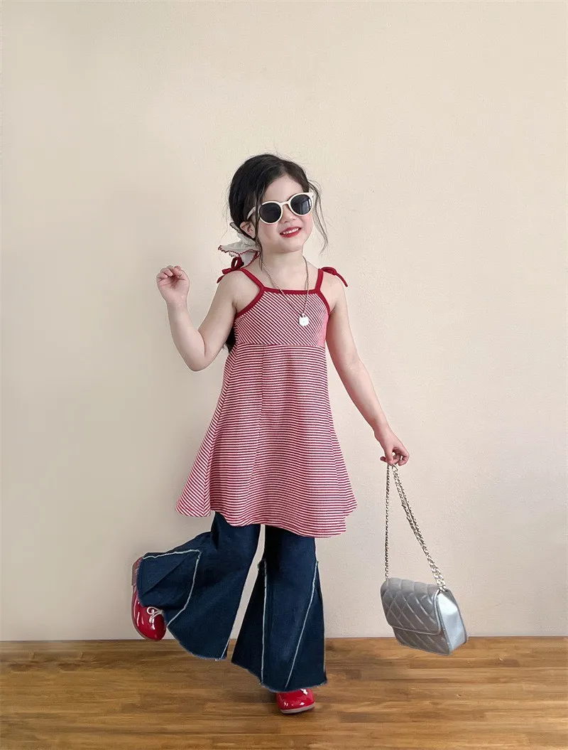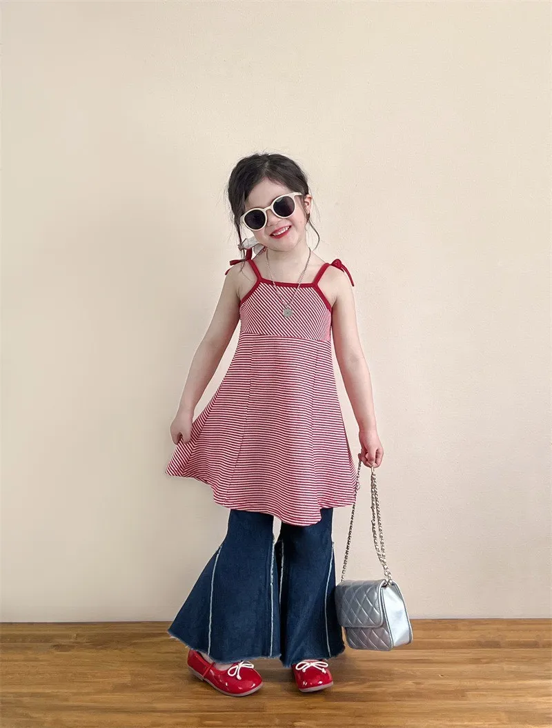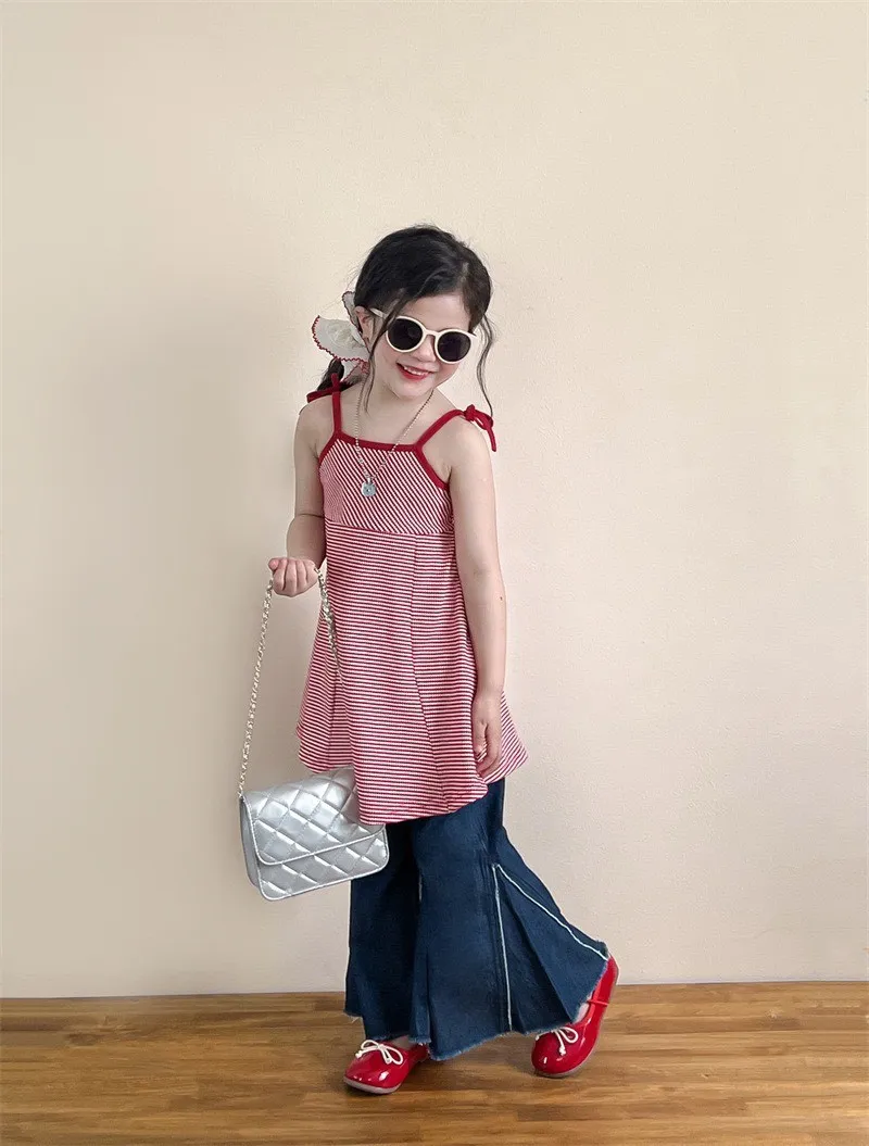 🎀 後背鏤空蝴蝶結吊帶裙甜美指數直接拉滿的小公主必備款 💕這件真的會讓人一眼愛上!細肩吊帶設計搭配「後背鏤空+大蝴蝶結」,走到哪都自帶回頭率✨👖 毛邊牛仔喇叭褲時髦小女孩一定要有的百搭神褲🔥休閒中帶點小個性,怎麼搭都好看!隨性中帶點潮流感✨微喇叭褲型修飾腿型,讓比例看起來更修長~