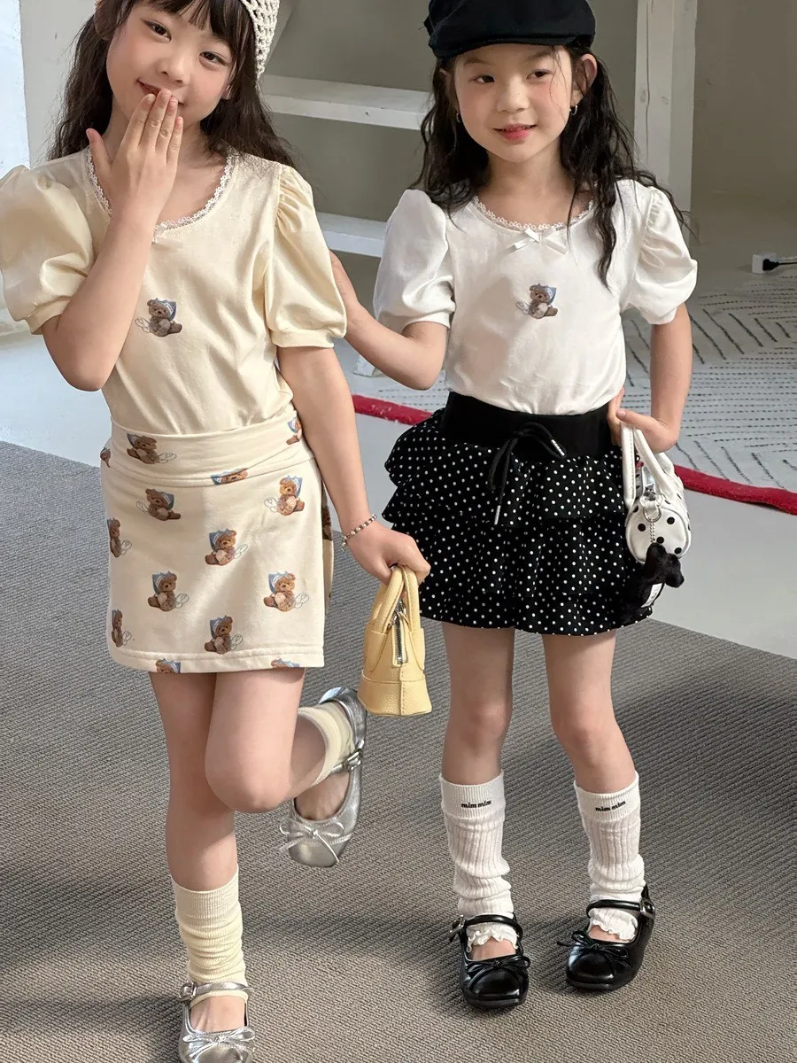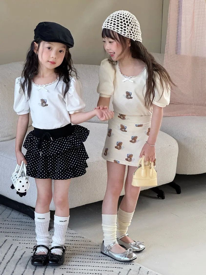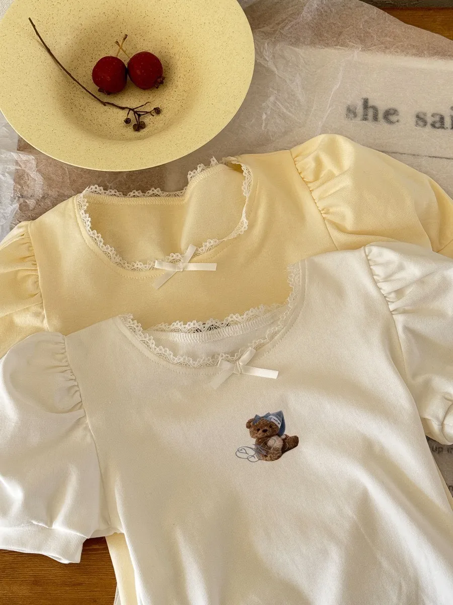 小熊印花蕾絲大圓領泡泡袖T恤 🧸