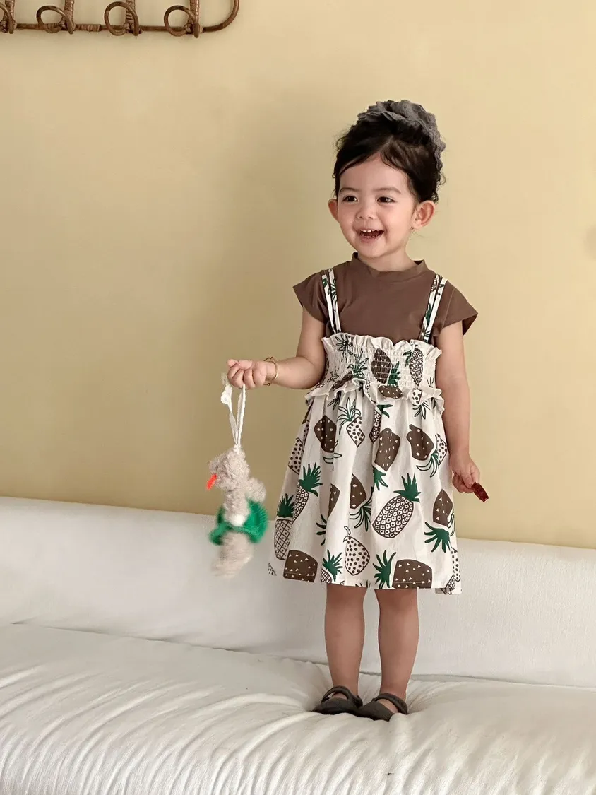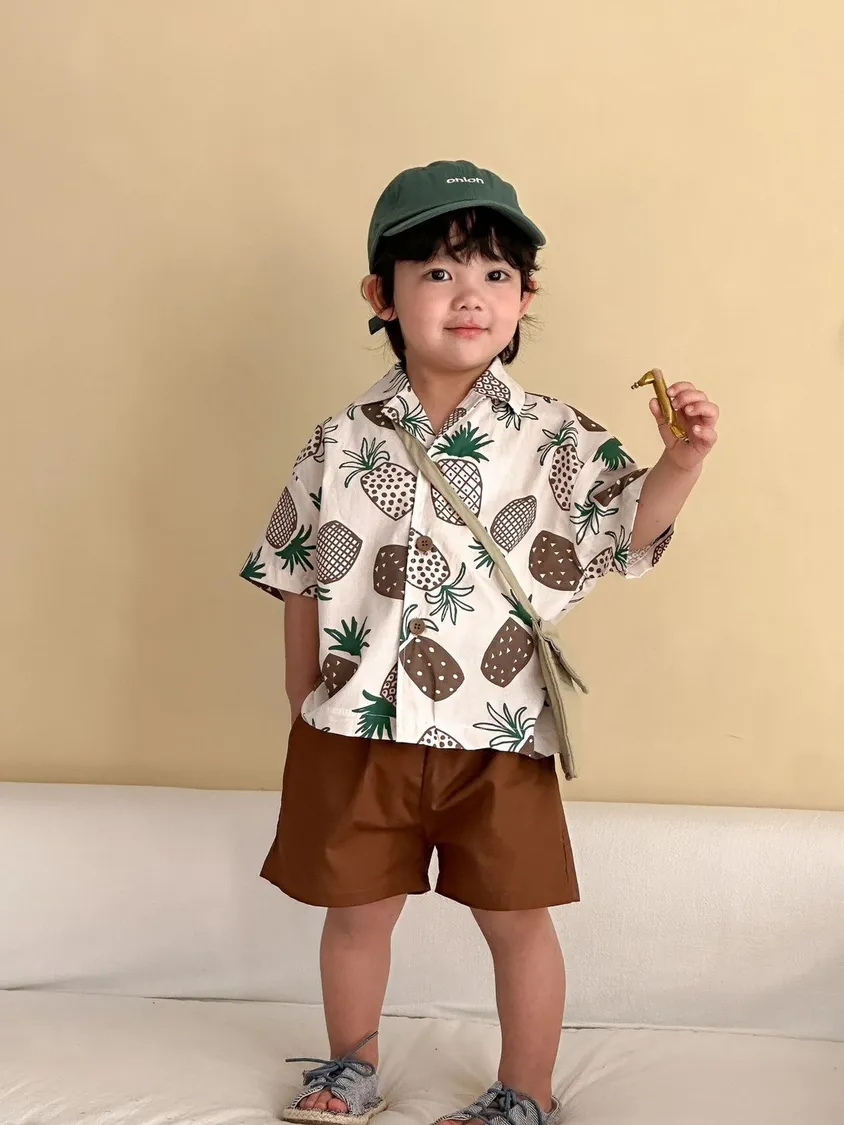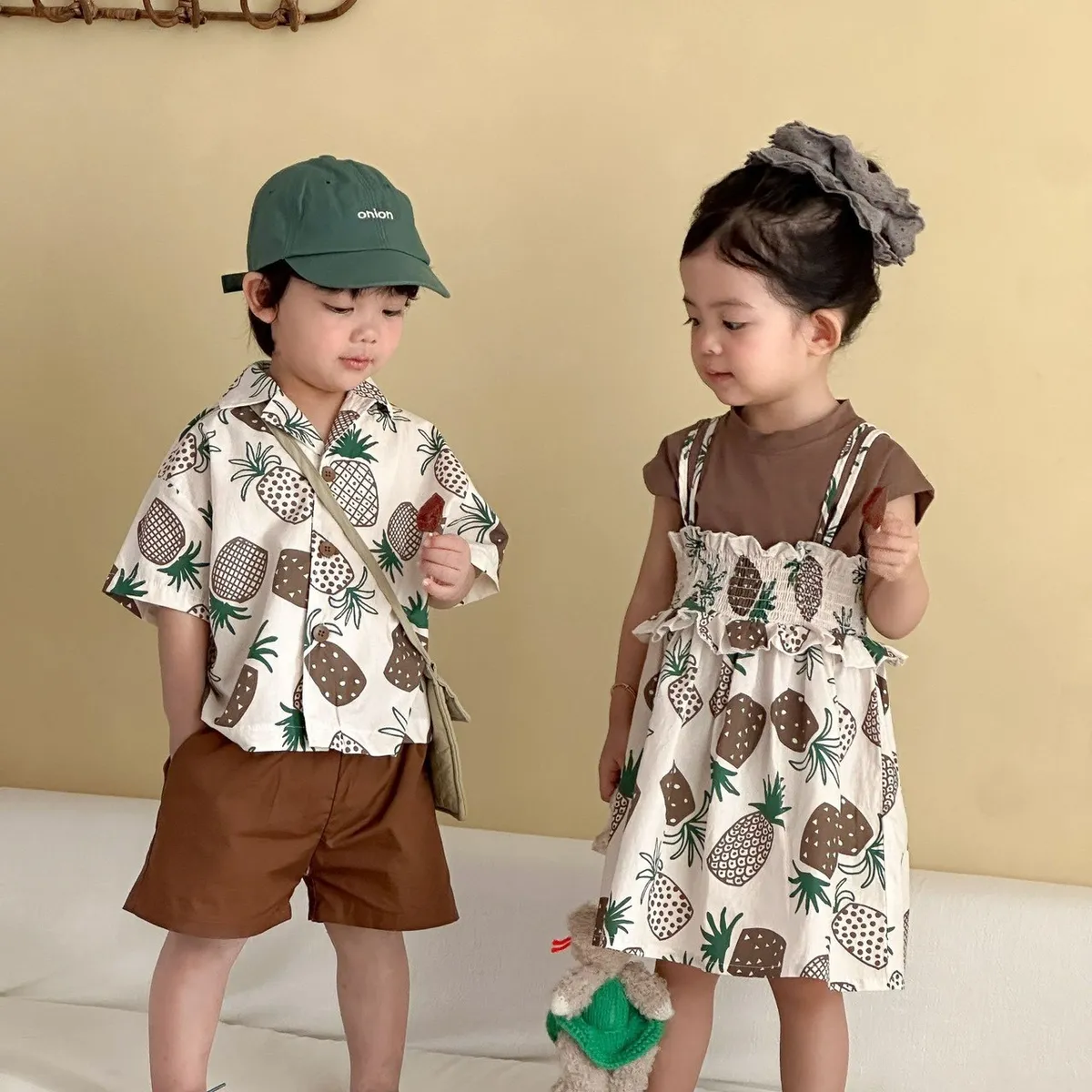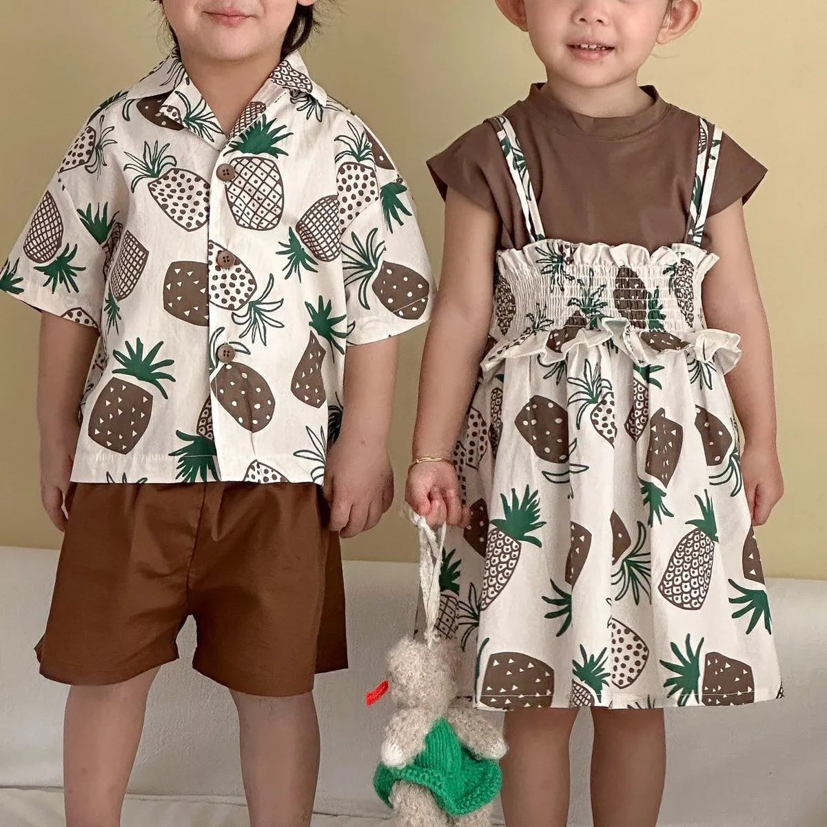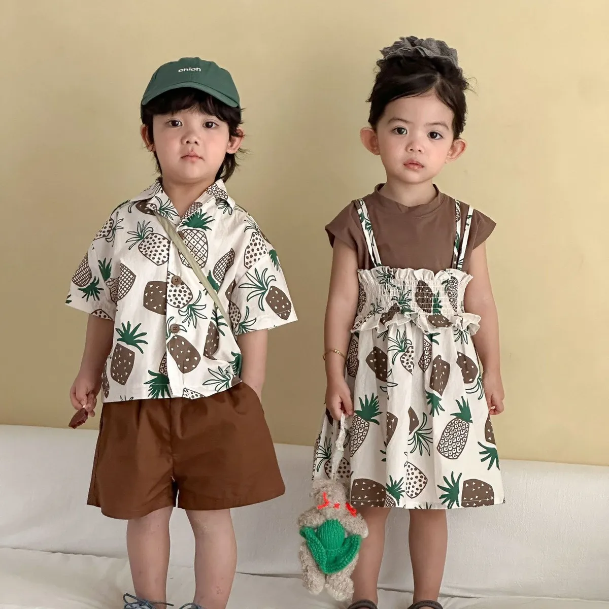 哥哥花襯衫+短褲、妹妹背心+吊帶連身裙