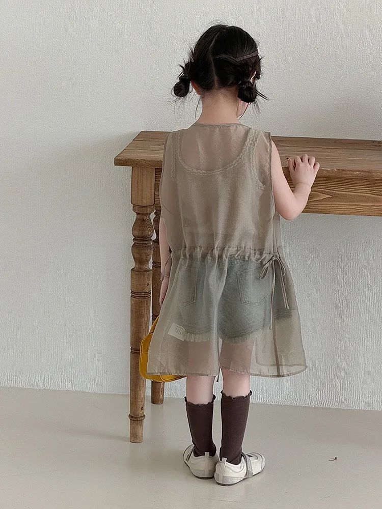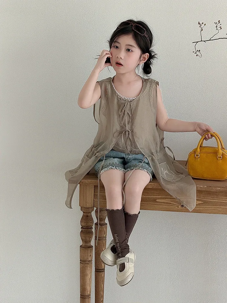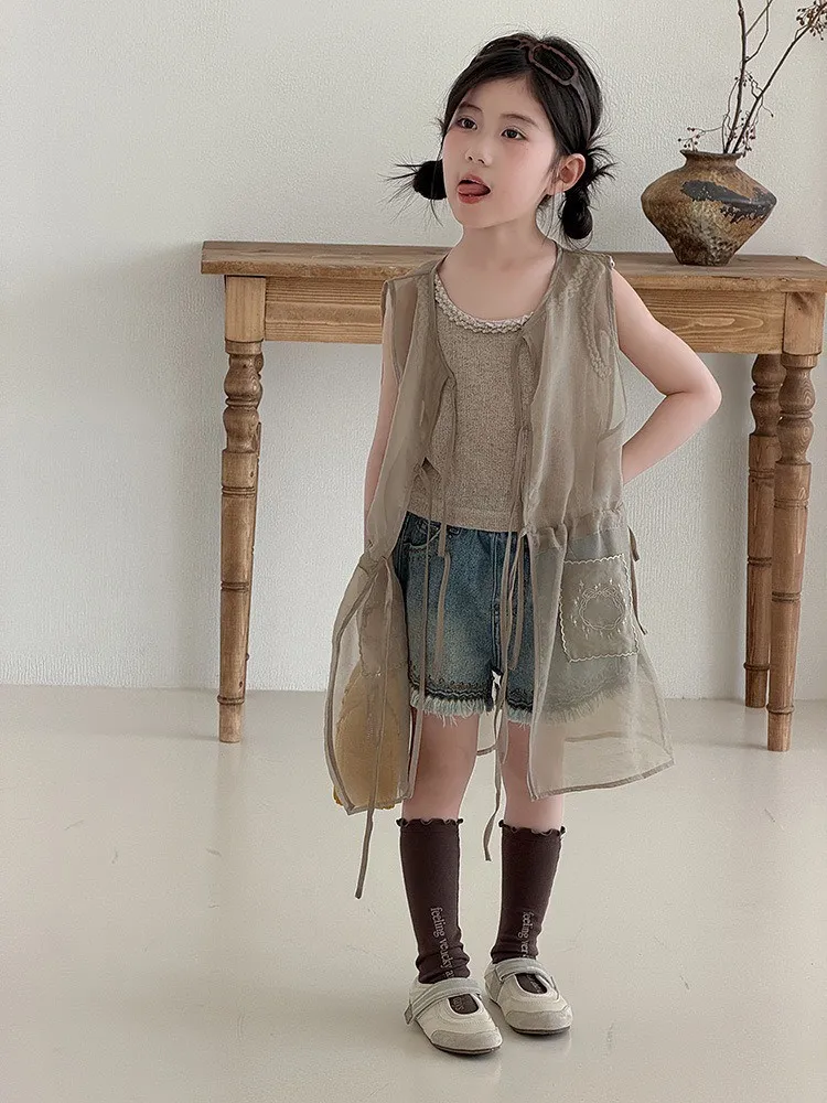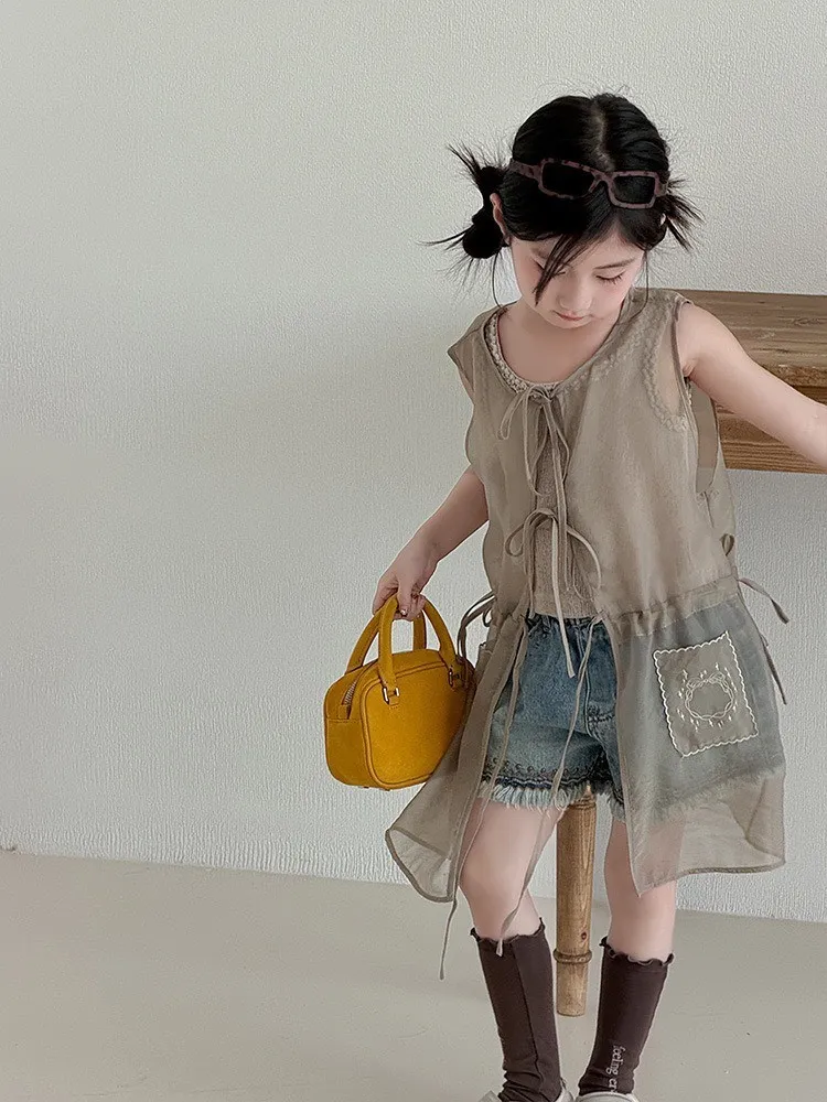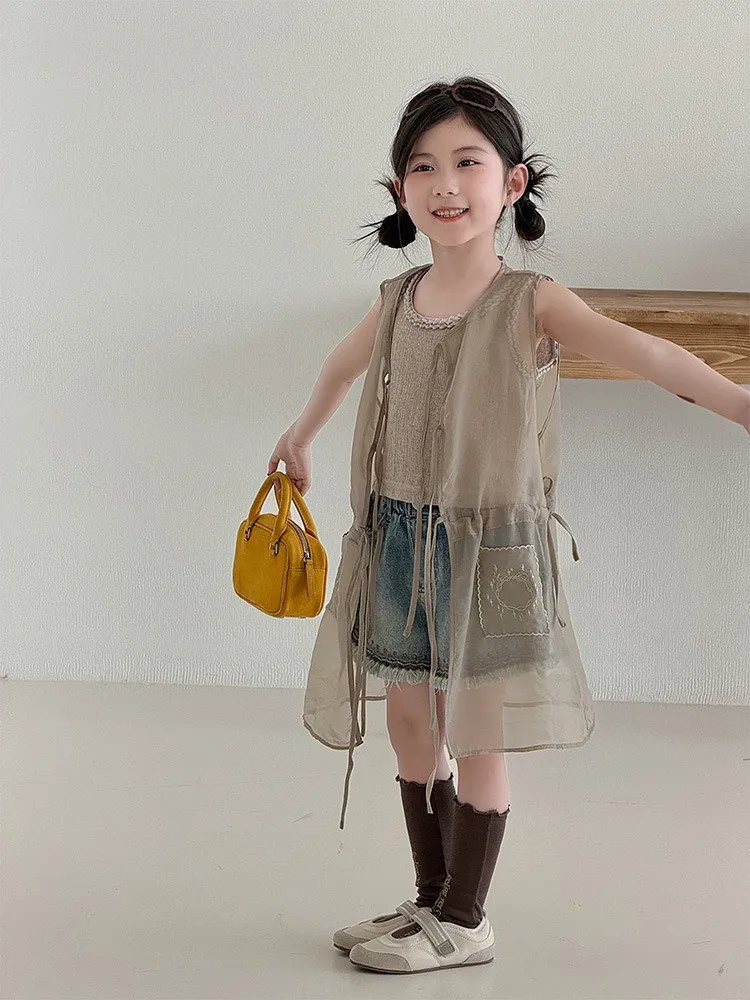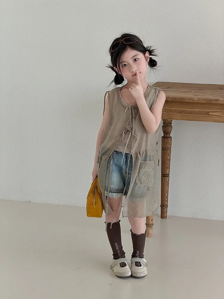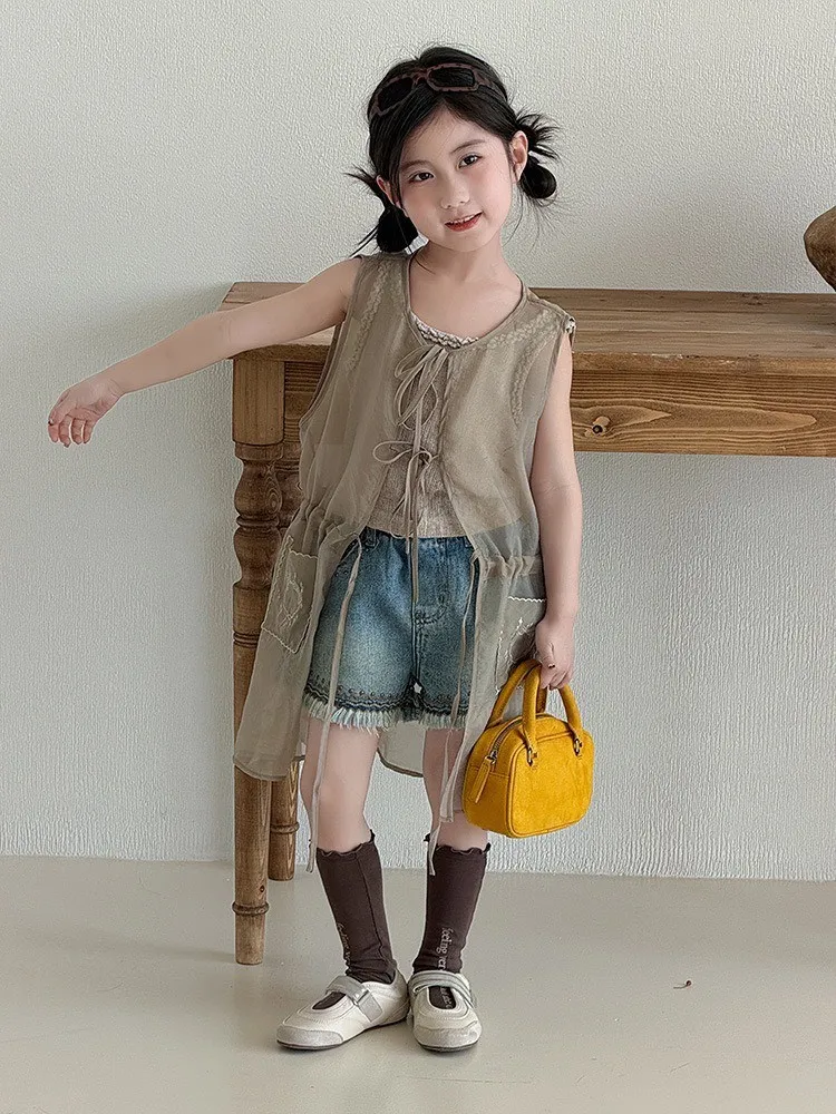 🌟【韓系百搭背心+設計感罩衫+百搭牛仔短褲】女童夏日潮搭三件套!